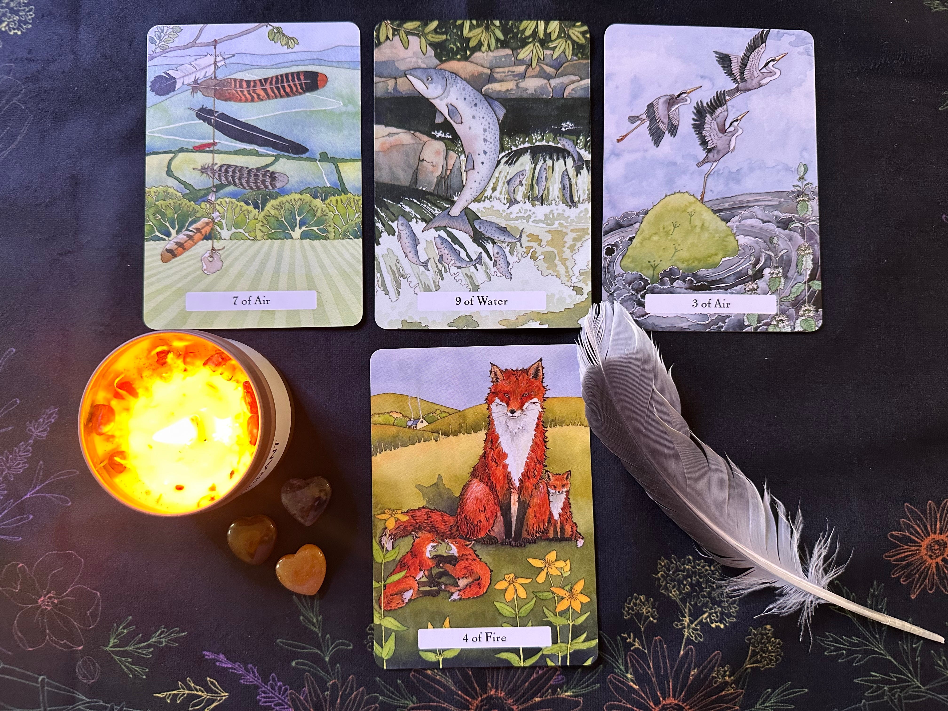 7 of Air: Witch’s Ladder. A charm made from 7 feathers, each of a different bird, used in spellcasting to make a dream come true. The card symbolizes clues, signs, insight, gratitude, offerings… and that magic is afoot.